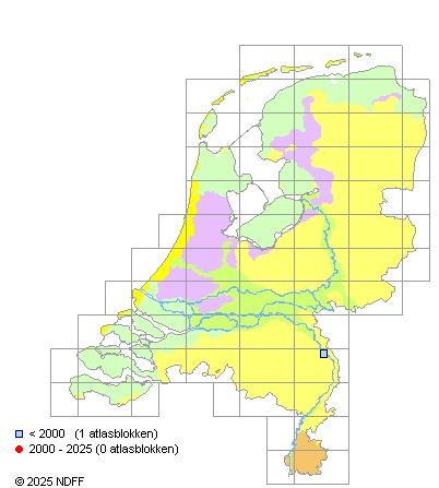 Het aantal atlasblokken (5x5 km) waarin de soort is gemeld binnen een periode van vijf jaar (vanaf 1980) of twintig jaar. Niet gecorrigeerd voor waarnemersinspanning en het aantal doorgegeven waarnemingen kan sterk variëren per periode, dus een trend in verspreiding kan hier niet direct uit worden afgelezen. Het opgegeven jaartal is het eerste jaar van de periode. Bron: gevalideerde waarnemingen uit de NDFF.