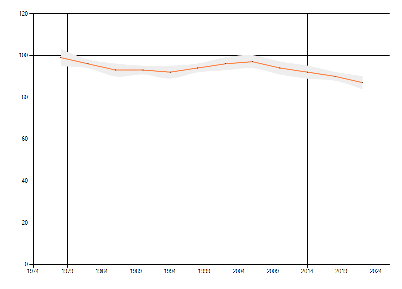 Gemiddelde trend van het aantal kilometerhokken waarin de soort voorkomt, weergegeven als indexcijfer (1975-1978 = 100). De trend is gecorrigeerd voor waarnemersinspanning en geeft de relatieve verandering in het aantal bezette kilometerhokken weer. Voor de berekening worden de data per periode van vier jaar samengenomen. In de grafiek correspondeert ieder punt met het laatste jaar van zo'n periode.