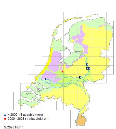 Het aantal atlasblokken (5x5 km) waarin de soort is gemeld binnen een periode van vijf jaar (vanaf 1980) of twintig jaar. Niet gecorrigeerd voor waarnemersinspanning en het aantal doorgegeven waarnemingen kan sterk variëren per periode, dus een trend in verspreiding kan hier niet direct uit worden afgelezen. Het opgegeven jaartal is het eerste jaar van de periode. Bron: gevalideerde waarnemingen uit de NDFF.