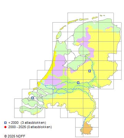 Het aantal atlasblokken (5x5 km) waarin de soort is gemeld binnen een periode van vijf jaar (vanaf 1980) of twintig jaar. Niet gecorrigeerd voor waarnemersinspanning en het aantal doorgegeven waarnemingen kan sterk variëren per periode, dus een trend in verspreiding kan hier niet direct uit worden afgelezen. Het opgegeven jaartal is het eerste jaar van de periode. Bron: gevalideerde waarnemingen uit de NDFF.