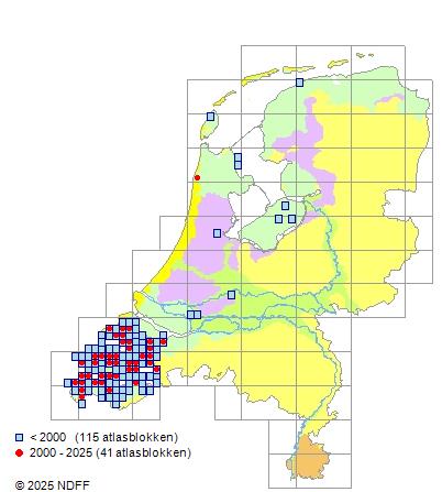 Het aantal atlasblokken (5x5 km) waarin de soort is gemeld binnen een periode van vijf jaar (vanaf 1980) of twintig jaar. Niet gecorrigeerd voor waarnemersinspanning en het aantal doorgegeven waarnemingen kan sterk variëren per periode, dus een trend in verspreiding kan hier niet direct uit worden afgelezen. Het opgegeven jaartal is het eerste jaar van de periode. Bron: gevalideerde waarnemingen uit de NDFF.