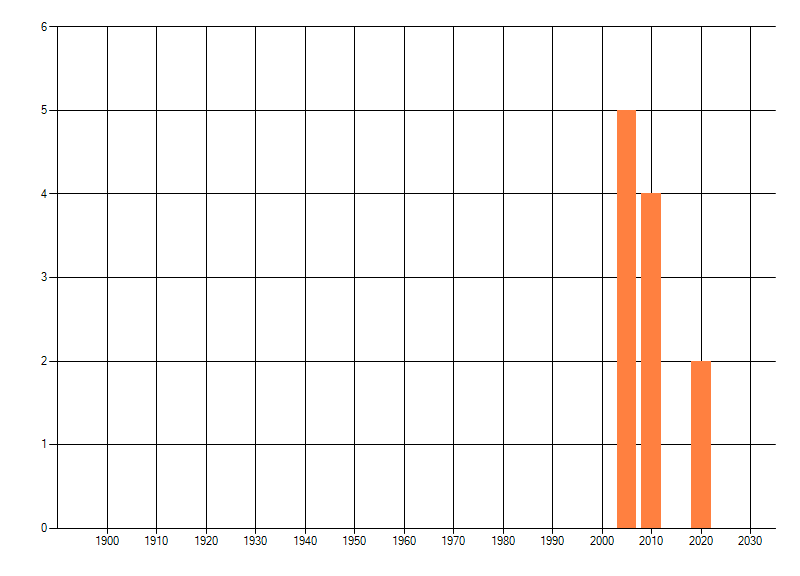 Het aantal atlasblokken (5x5 km) waarin de soort is gemeld binnen een periode van vijf jaar (vanaf 1980) of twintig jaar. Niet gecorrigeerd voor waarnemersinspanning en het aantal doorgegeven waarnemingen kan sterk variëren per periode, dus een trend in verspreiding kan hier niet direct uit worden afgelezen. Het opgegeven jaartal is het eerste jaar van de periode. Bron: gevalideerde waarnemingen uit de NDFF.