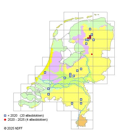Het aantal atlasblokken (5x5 km) waarin de soort is gemeld binnen een periode van vijf jaar (vanaf 1980) of twintig jaar. Niet gecorrigeerd voor waarnemersinspanning en het aantal doorgegeven waarnemingen kan sterk variëren per periode, dus een trend in verspreiding kan hier niet direct uit worden afgelezen. Het opgegeven jaartal is het eerste jaar van de periode. Bron: gevalideerde waarnemingen uit de NDFF.