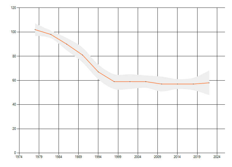 Gemiddelde trend van het aantal kilometerhokken waarin de soort voorkomt, weergegeven als indexcijfer (1975-1978 = 100). De trend is gecorrigeerd voor waarnemersinspanning en geeft de relatieve verandering in het aantal bezette kilometerhokken weer. Voor de berekening worden de data per periode van vier jaar samengenomen. In de grafiek correspondeert ieder punt met het laatste jaar van zo'n periode.