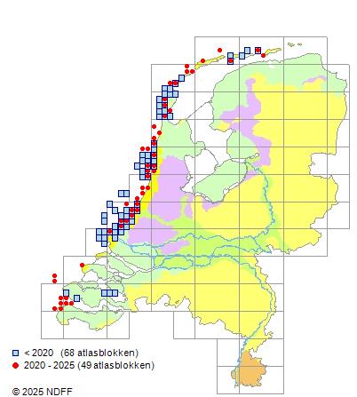 Het aantal atlasblokken (5x5 km) waarin de soort is gemeld binnen een periode van vijf jaar (vanaf 1980) of twintig jaar.