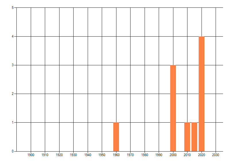 Het aantal atlasblokken (5x5 km) waarin de soort is gemeld binnen een periode van vijf jaar (vanaf 1980) of twintig jaar. Niet gecorrigeerd voor waarnemersinspanning en het aantal doorgegeven waarnemingen kan sterk variëren per periode, dus een trend in verspreiding kan hier niet direct uit worden afgelezen. Het opgegeven jaartal is het eerste jaar van de periode. Bron: gevalideerde waarnemingen uit de NDFF.
