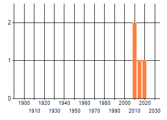 Het aantal atlasblokken (5x5 km) waarin de soort is gemeld binnen een periode van vijf jaar (vanaf 1980) of twintig jaar. Niet gecorrigeerd voor waarnemersinspanning en het aantal doorgegeven waarnemingen kan sterk variëren per periode, dus een trend in verspreiding kan hier niet direct uit worden afgelezen. Het opgegeven jaartal is het eerste jaar van de periode. Bron: gevalideerde waarnemingen uit de NDFF.