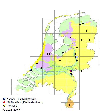 Het aantal atlasblokken (5x5 km) waarin de soort is gemeld binnen een periode van vijf jaar (vanaf 1980) of twintig jaar. Niet gecorrigeerd voor waarnemersinspanning en het aantal doorgegeven waarnemingen kan sterk variëren per periode, dus een trend in verspreiding kan hier niet direct uit worden afgelezen. Het opgegeven jaartal is het eerste jaar van de periode. Bron: gevalideerde waarnemingen uit de NDFF.