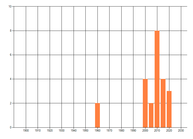 Het aantal atlasblokken (5x5 km) waarin de soort is gemeld binnen een periode van vijf jaar (vanaf 1980) of twintig jaar. Niet gecorrigeerd voor waarnemersinspanning en het aantal doorgegeven waarnemingen kan sterk variëren per periode, dus een trend in verspreiding kan hier niet direct uit worden afgelezen. Het opgegeven jaartal is het eerste jaar van de periode. Bron: gevalideerde waarnemingen uit de NDFF.