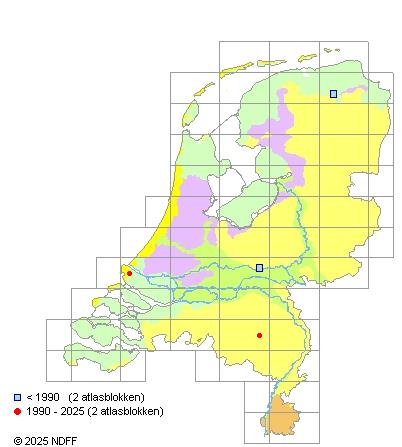 Het aantal atlasblokken (5x5 km) waarin de soort is gemeld binnen een periode van vijf jaar (vanaf 1980) of twintig jaar. Niet gecorrigeerd voor waarnemersinspanning en het aantal doorgegeven waarnemingen kan sterk variëren per periode, dus een trend in verspreiding kan hier niet direct uit worden afgelezen. Het opgegeven jaartal is het eerste jaar van de periode. Bron: gevalideerde waarnemingen uit de NDFF.