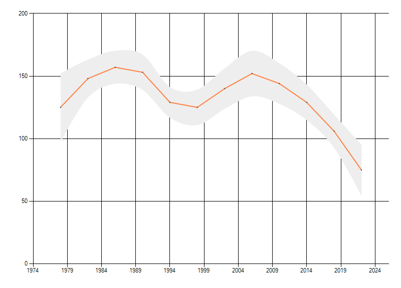 Gemiddelde trend van het aantal kilometerhokken waarin de soort voorkomt, weergegeven als indexcijfer (1975-1978 = 100). De trend is gecorrigeerd voor waarnemersinspanning en geeft de relatieve verandering in het aantal bezette kilometerhokken weer. Voor de berekening worden de data per periode van vier jaar samengenomen. In de grafiek correspondeert ieder punt met het laatste jaar van zo'n periode.