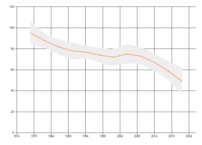 Gemiddelde trend van het aantal kilometerhokken waarin de soort voorkomt, weergegeven als indexcijfer (1975-1978 = 100). De trend is gecorrigeerd voor waarnemersinspanning en geeft de relatieve verandering in het aantal bezette kilometerhokken weer. Voor de berekening worden de data per periode van vier jaar samengenomen. In de grafiek correspondeert ieder punt met het laatste jaar van zo'n periode.