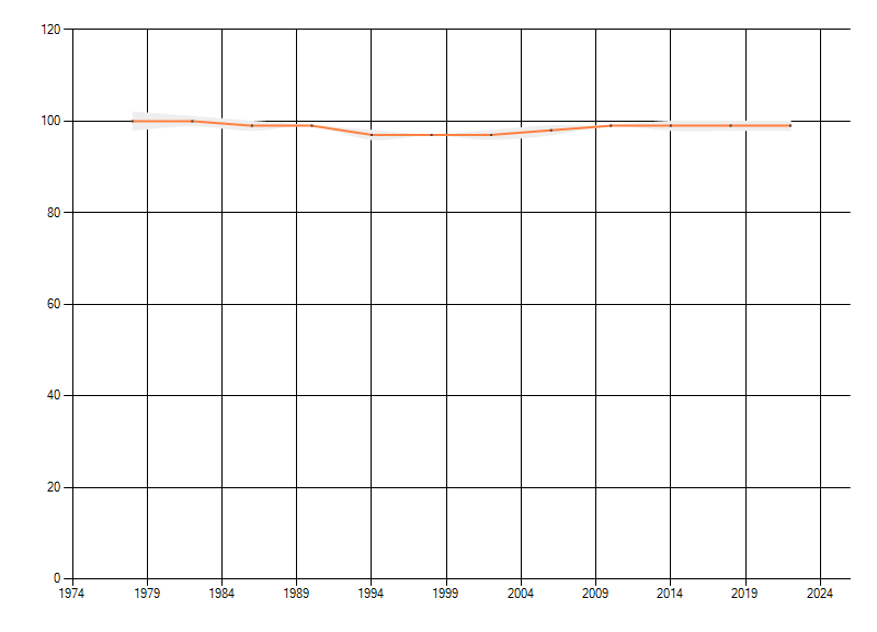 Gemiddelde trend van het aantal kilometerhokken waarin de soort voorkomt, weergegeven als indexcijfer (1975-1978 = 100). De trend is gecorrigeerd voor waarnemersinspanning en geeft de relatieve verandering in het aantal bezette kilometerhokken weer. Voor de berekening worden de data per periode van vier jaar samengenomen. In de grafiek correspondeert ieder punt met het laatste jaar van zo'n periode.