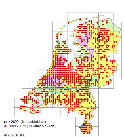 Het aantal atlasblokken (5x5 km) waarin de soort is gemeld binnen een periode van vijf jaar (vanaf 1980) of twintig jaar. Niet gecorrigeerd voor waarnemersinspanning en het aantal doorgegeven waarnemingen kan sterk variëren per periode, dus een trend in verspreiding kan hier niet direct uit worden afgelezen. Het opgegeven jaartal is het eerste jaar van de periode. Bron: gevalideerde waarnemingen uit de NDFF.