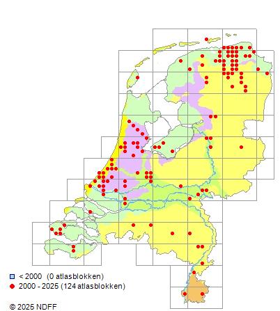 Het aantal atlasblokken (5x5 km) waarin de soort is gemeld binnen een periode van vijf jaar (vanaf 1980) of twintig jaar. Niet gecorrigeerd voor waarnemersinspanning en het aantal doorgegeven waarnemingen kan sterk variëren per periode, dus een trend in verspreiding kan hier niet direct uit worden afgelezen. Het opgegeven jaartal is het eerste jaar van de periode. Bron: gevalideerde waarnemingen uit de NDFF.
