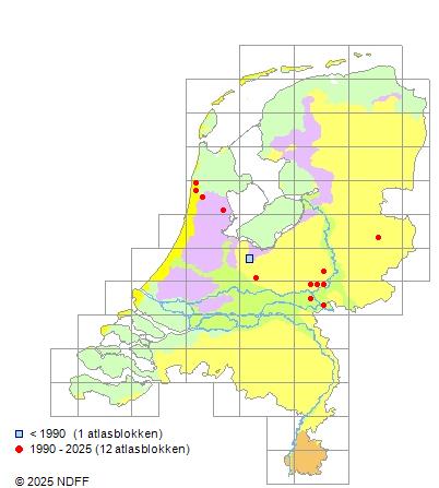 Het aantal atlasblokken (5x5 km) waarin de soort is gemeld binnen een periode van vijf jaar (vanaf 1980) of twintig jaar. Niet gecorrigeerd voor waarnemersinspanning en het aantal doorgegeven waarnemingen kan sterk variëren per periode, dus een trend in verspreiding kan hier niet direct uit worden afgelezen. Het opgegeven jaartal is het eerste jaar van de periode. Bron: gevalideerde waarnemingen uit de NDFF.
