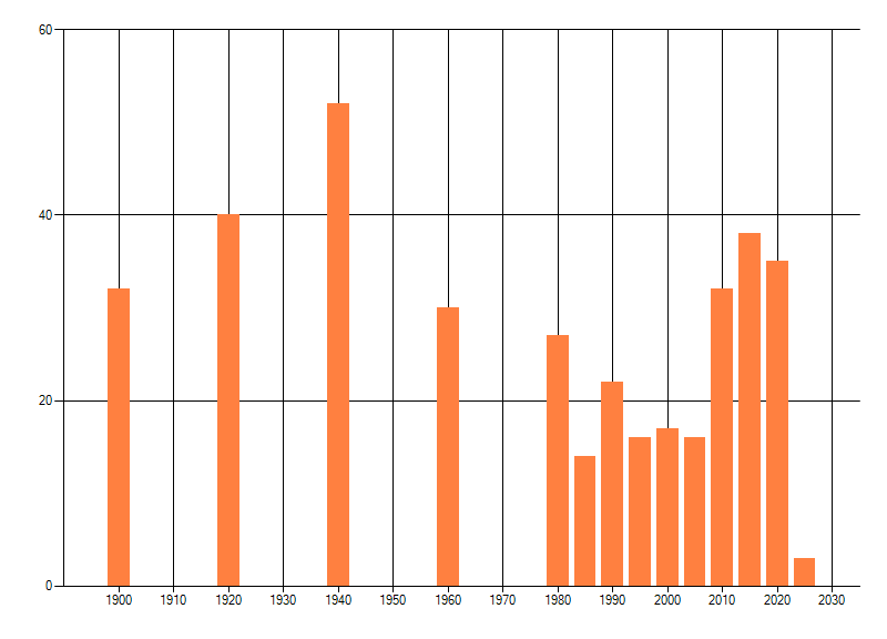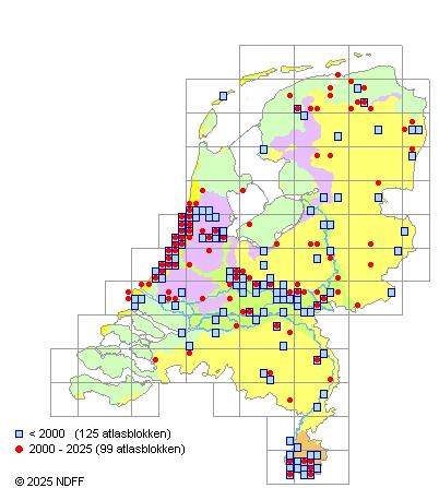 Het aantal atlasblokken (5x5 km) waarin de soort is gemeld binnen een periode van vijf jaar (vanaf 1980) of twintig jaar. Niet gecorrigeerd voor waarnemersinspanning en het aantal doorgegeven waarnemingen kan sterk variƫren per periode, dus een trend in verspreiding kan hier niet direct uit worden afgelezen. Het opgegeven jaartal is het eerste jaar van de periode. Bron: gevalideerde waarnemingen uit de NDFF.