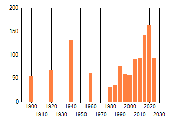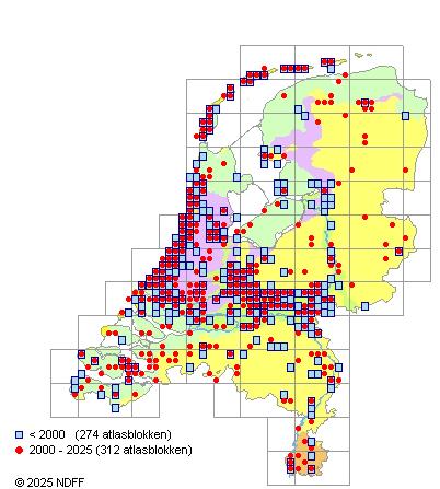 Het aantal atlasblokken (5x5 km) waarin de soort is gemeld binnen een periode van vijf jaar (vanaf 1980) of twintig jaar. Niet gecorrigeerd voor waarnemersinspanning en het aantal doorgegeven waarnemingen kan sterk variƫren per periode, dus een trend in verspreiding kan hier niet direct uit worden afgelezen. Het opgegeven jaartal is het eerste jaar van de periode. Bron: gevalideerde waarnemingen uit de NDFF.