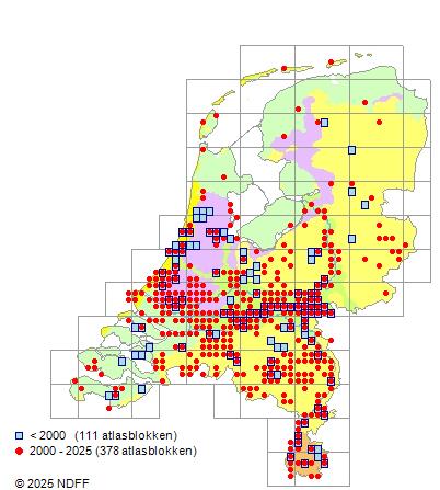 Het aantal atlasblokken (5x5 km) waarin de soort is gemeld binnen een periode van vijf jaar (vanaf 1980) of twintig jaar. Niet gecorrigeerd voor waarnemersinspanning en het aantal doorgegeven waarnemingen kan sterk variëren per periode, dus een trend in verspreiding kan hier niet direct uit worden afgelezen. Het opgegeven jaartal is het eerste jaar van de periode. Bron: gevalideerde waarnemingen uit de NDFF.