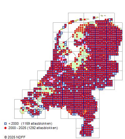 Het aantal atlasblokken (5x5 km) waarin de soort is gemeld binnen een periode van vijf jaar (vanaf 1980) of twintig jaar. Niet gecorrigeerd voor waarnemersinspanning en het aantal doorgegeven waarnemingen kan sterk variëren per periode, dus een trend in verspreiding kan hier niet direct uit worden afgelezen. Het opgegeven jaartal is het eerste jaar van de periode. Bron: gevalideerde waarnemingen uit de NDFF.
