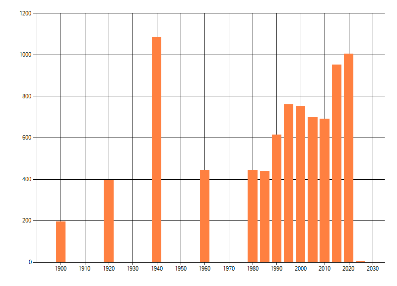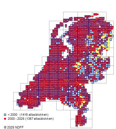 Het aantal atlasblokken (5x5 km) waarin de soort is gemeld binnen een periode van vijf jaar (vanaf 1980) of twintig jaar. Niet gecorrigeerd voor waarnemersinspanning en het aantal doorgegeven waarnemingen kan sterk variƫren per periode, dus een trend in verspreiding kan hier niet direct uit worden afgelezen. Het opgegeven jaartal is het eerste jaar van de periode. Bron: gevalideerde waarnemingen uit de NDFF.