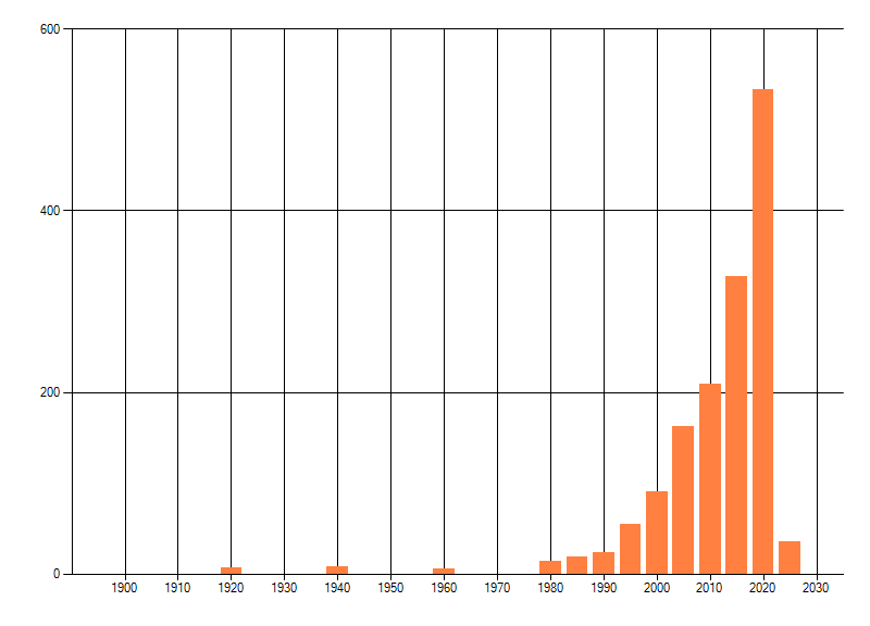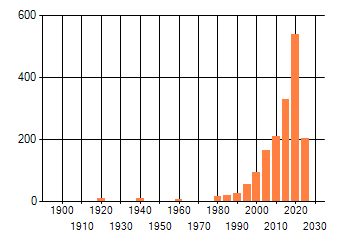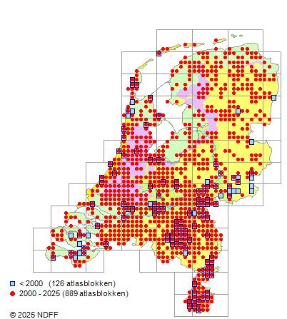 Het aantal atlasblokken (5x5 km) waarin de soort is gemeld binnen een periode van vijf jaar (vanaf 1980) of twintig jaar. Niet gecorrigeerd voor waarnemersinspanning en het aantal doorgegeven waarnemingen kan sterk variëren per periode, dus een trend in verspreiding kan hier niet direct uit worden afgelezen. Het opgegeven jaartal is het eerste jaar van de periode. Bron: gevalideerde waarnemingen uit de NDFF.