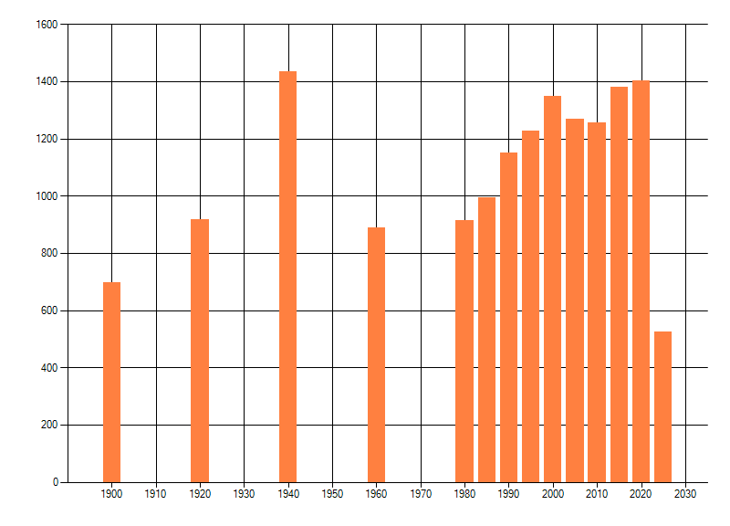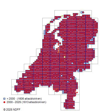 Het aantal atlasblokken (5x5 km) waarin de soort is gemeld binnen een periode van vijf jaar (vanaf 1980) of twintig jaar. Niet gecorrigeerd voor waarnemersinspanning en het aantal doorgegeven waarnemingen kan sterk variƫren per periode, dus een trend in verspreiding kan hier niet direct uit worden afgelezen. Het opgegeven jaartal is het eerste jaar van de periode. Bron: gevalideerde waarnemingen uit de NDFF.