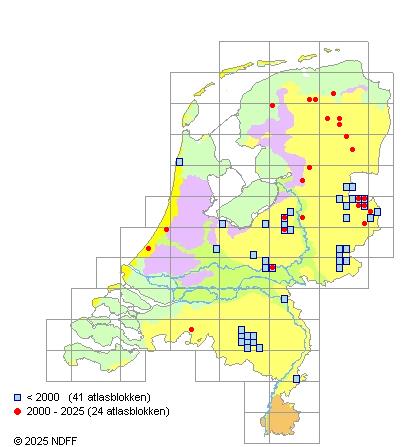 Het aantal atlasblokken (5x5 km) waarin de soort is gemeld binnen een periode van vijf jaar (vanaf 1980) of twintig jaar. Niet gecorrigeerd voor waarnemersinspanning en het aantal doorgegeven waarnemingen kan sterk variëren per periode, dus een trend in verspreiding kan hier niet direct uit worden afgelezen. Het opgegeven jaartal is het eerste jaar van de periode. Bron: gevalideerde waarnemingen uit de NDFF.