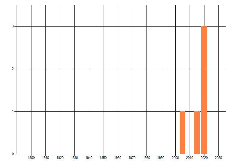 Het aantal atlasblokken (5x5 km) waarin de soort is gemeld binnen een periode van vijf jaar (vanaf 1980) of twintig jaar. Niet gecorrigeerd voor waarnemersinspanning en het aantal doorgegeven waarnemingen kan sterk variëren per periode, dus een trend in verspreiding kan hier niet direct uit worden afgelezen. Het opgegeven jaartal is het eerste jaar van de periode. Bron: gevalideerde waarnemingen uit de NDFF.