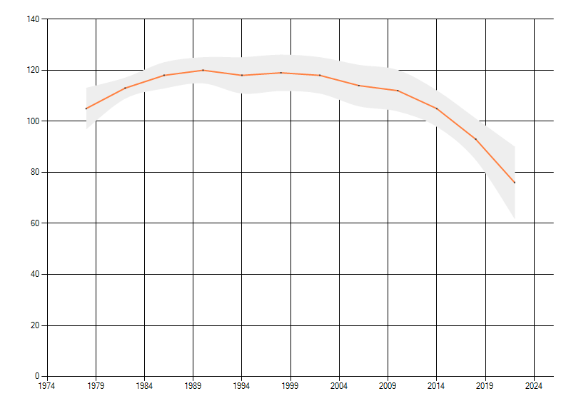 Gemiddelde trend van het aantal kilometerhokken waarin de soort voorkomt, weergegeven als indexcijfer (1975-1978 = 100). De trend is gecorrigeerd voor waarnemersinspanning en geeft de relatieve verandering in het aantal bezette kilometerhokken weer. Voor de berekening worden de data per periode van vier jaar samengenomen. In de grafiek correspondeert ieder punt met het laatste jaar van zo'n periode.