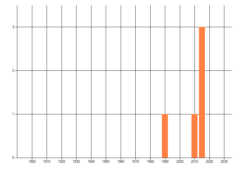 Het aantal atlasblokken (5x5 km) waarin de soort is gemeld binnen een periode van vijf jaar (vanaf 1980) of twintig jaar. Niet gecorrigeerd voor waarnemersinspanning en het aantal doorgegeven waarnemingen kan sterk variëren per periode, dus een trend in verspreiding kan hier niet direct uit worden afgelezen. Het opgegeven jaartal is het eerste jaar van de periode. Bron: gevalideerde waarnemingen uit de NDFF.