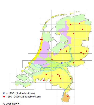 Het aantal atlasblokken (5x5 km) waarin de soort is gemeld binnen een periode van vijf jaar (vanaf 1980) of twintig jaar. Niet gecorrigeerd voor waarnemersinspanning en het aantal doorgegeven waarnemingen kan sterk variëren per periode, dus een trend in verspreiding kan hier niet direct uit worden afgelezen. Het opgegeven jaartal is het eerste jaar van de periode. Bron: gevalideerde waarnemingen uit de NDFF.
