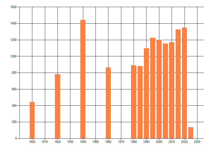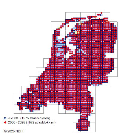 Het aantal atlasblokken (5x5 km) waarin de soort is gemeld binnen een periode van vijf jaar (vanaf 1980) of twintig jaar. Niet gecorrigeerd voor waarnemersinspanning en het aantal doorgegeven waarnemingen kan sterk variëren per periode, dus een trend in verspreiding kan hier niet direct uit worden afgelezen. Het opgegeven jaartal is het eerste jaar van de periode. Bron: gevalideerde waarnemingen uit de NDFF.