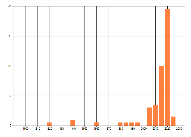 Het aantal atlasblokken (5x5 km) waarin de soort is gemeld binnen een periode van vijf jaar (vanaf 1980) of twintig jaar. Niet gecorrigeerd voor waarnemersinspanning en het aantal doorgegeven waarnemingen kan sterk variëren per periode, dus een trend in verspreiding kan hier niet direct uit worden afgelezen. Het opgegeven jaartal is het eerste jaar van de periode. Bron: gevalideerde waarnemingen uit de NDFF.