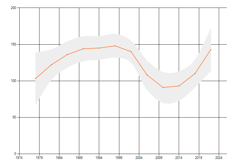 Gemiddelde trend van het aantal kilometerhokken waarin de soort voorkomt, weergegeven als indexcijfer (1975-1978 = 100).