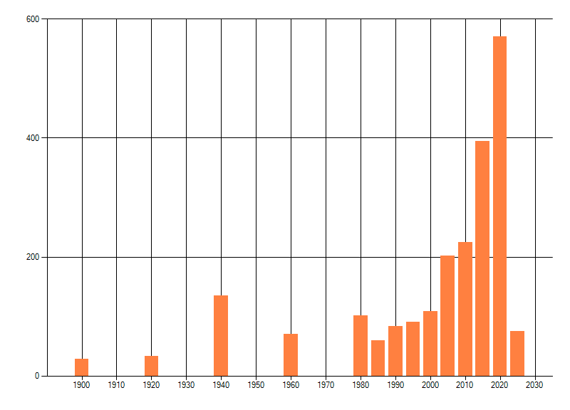 Het aantal atlasblokken (5x5 km) waarin de soort is gemeld binnen een periode van vijf jaar (vanaf 1980) of twintig jaar. Niet gecorrigeerd voor waarnemersinspanning en het aantal doorgegeven waarnemingen kan sterk variëren per periode, dus een trend in verspreiding kan hier niet direct uit worden afgelezen. Het opgegeven jaartal is het eerste jaar van de periode. Bron: gevalideerde waarnemingen uit de NDFF.