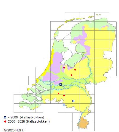Het aantal atlasblokken (5x5 km) waarin de soort is gemeld binnen een periode van vijf jaar (vanaf 1980) of twintig jaar. Niet gecorrigeerd voor waarnemersinspanning en het aantal doorgegeven waarnemingen kan sterk variëren per periode, dus een trend in verspreiding kan hier niet direct uit worden afgelezen. Het opgegeven jaartal is het eerste jaar van de periode. Bron: gevalideerde waarnemingen uit de NDFF.
