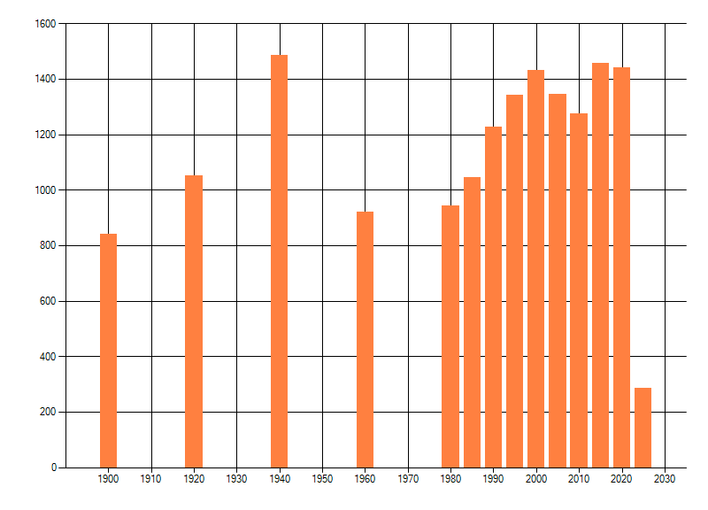 Het aantal atlasblokken (5x5 km) waarin de soort is gemeld binnen een periode van vijf jaar (vanaf 1980) of twintig jaar. Niet gecorrigeerd voor waarnemersinspanning en het aantal doorgegeven waarnemingen kan sterk variƫren per periode, dus een trend in verspreiding kan hier niet direct uit worden afgelezen. Het opgegeven jaartal is het eerste jaar van de periode. Bron: gevalideerde waarnemingen uit de NDFF.