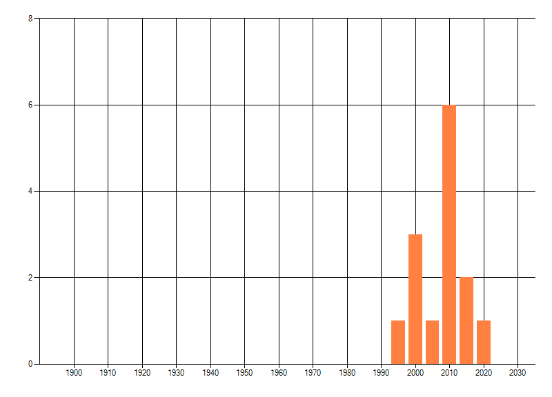 Het aantal atlasblokken (5x5 km) waarin de soort is gemeld binnen een periode van vijf jaar (vanaf 1980) of twintig jaar. Niet gecorrigeerd voor waarnemersinspanning en het aantal doorgegeven waarnemingen kan sterk variëren per periode, dus een trend in verspreiding kan hier niet direct uit worden afgelezen. Het opgegeven jaartal is het eerste jaar van de periode. Bron: gevalideerde waarnemingen uit de NDFF.