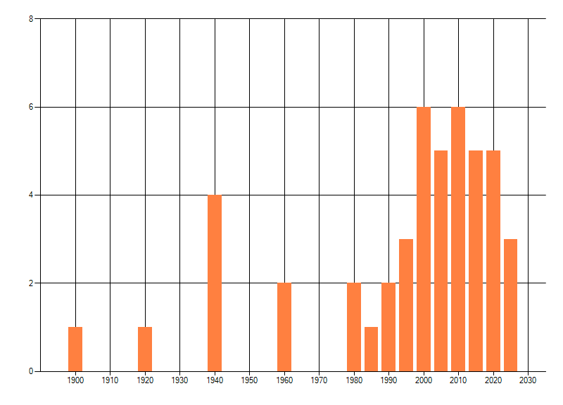Het aantal atlasblokken (5x5 km) waarin de soort is gemeld binnen een periode van vijf jaar (vanaf 1980) of twintig jaar. Niet gecorrigeerd voor waarnemersinspanning en het aantal doorgegeven waarnemingen kan sterk variëren per periode, dus een trend in verspreiding kan hier niet direct uit worden afgelezen. Het opgegeven jaartal is het eerste jaar van de periode. Bron: gevalideerde waarnemingen uit de NDFF.