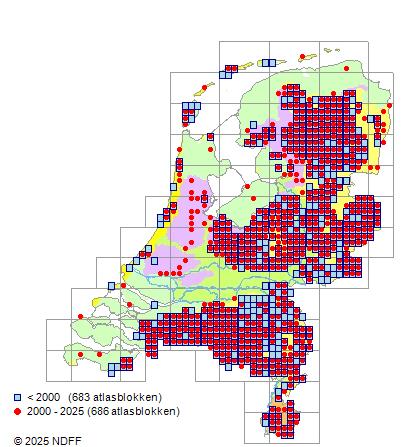 Het aantal atlasblokken (5x5 km) waarin de soort is gemeld binnen een periode van vijf jaar (vanaf 1980) of twintig jaar. Niet gecorrigeerd voor waarnemersinspanning en het aantal doorgegeven waarnemingen kan sterk variëren per periode, dus een trend in verspreiding kan hier niet direct uit worden afgelezen. Het opgegeven jaartal is het eerste jaar van de periode. Bron: gevalideerde waarnemingen uit de NDFF.
