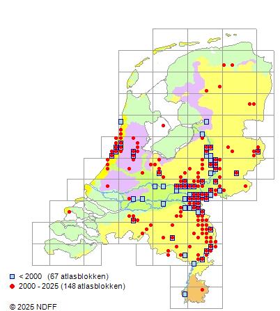 Het aantal atlasblokken (5x5 km) waarin de soort is gemeld binnen een periode van vijf jaar (vanaf 1980) of twintig jaar. Niet gecorrigeerd voor waarnemersinspanning en het aantal doorgegeven waarnemingen kan sterk variëren per periode, dus een trend in verspreiding kan hier niet direct uit worden afgelezen. Het opgegeven jaartal is het eerste jaar van de periode. Bron: gevalideerde waarnemingen uit de NDFF.