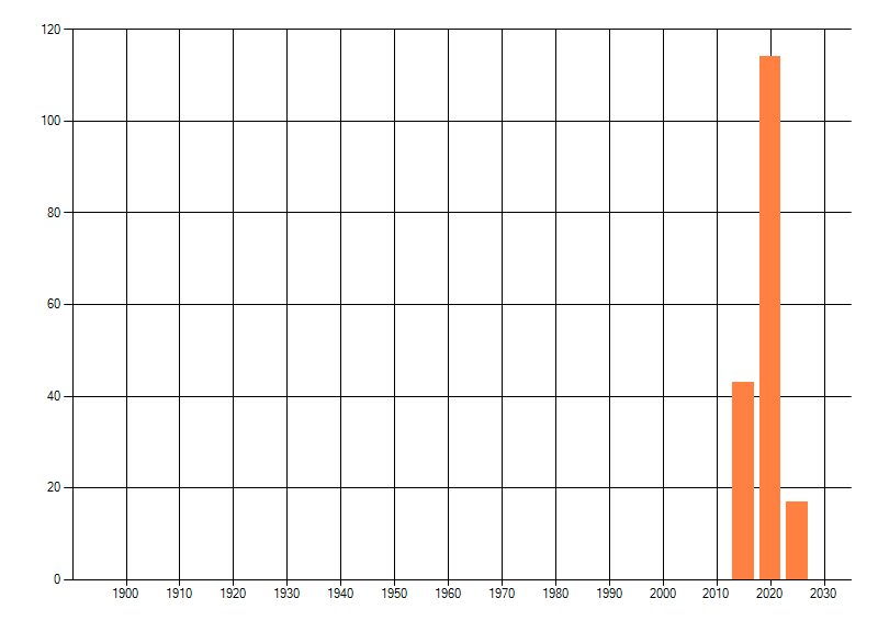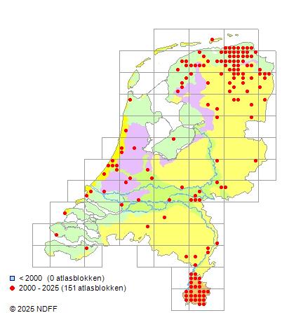 Het aantal atlasblokken (5x5 km) waarin de soort is gemeld binnen een periode van vijf jaar (vanaf 1980) of twintig jaar. Niet gecorrigeerd voor waarnemersinspanning en het aantal doorgegeven waarnemingen kan sterk variëren per periode, dus een trend in verspreiding kan hier niet direct uit worden afgelezen. Het opgegeven jaartal is het eerste jaar van de periode. Bron: gevalideerde waarnemingen uit de NDFF.