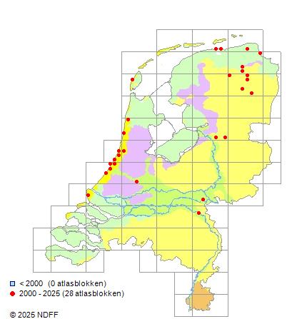 Het aantal atlasblokken (5x5 km) waarin de soort is gemeld binnen een periode van vijf jaar (vanaf 1980) of twintig jaar. Niet gecorrigeerd voor waarnemersinspanning en het aantal doorgegeven waarnemingen kan sterk variëren per periode, dus een trend in verspreiding kan hier niet direct uit worden afgelezen. Het opgegeven jaartal is het eerste jaar van de periode. Bron: gevalideerde waarnemingen uit de NDFF.
