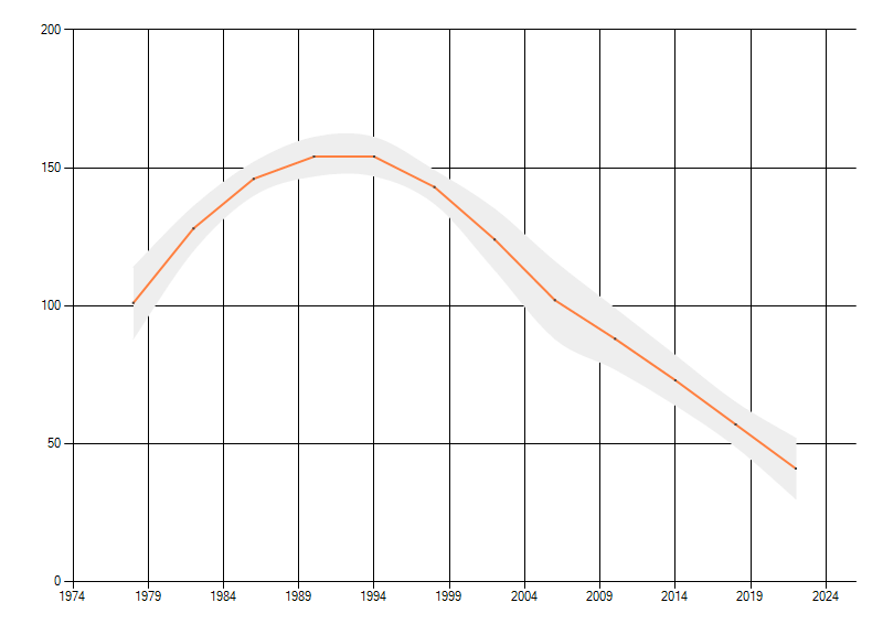 Gemiddelde trend van het aantal kilometerhokken waarin de soort voorkomt, weergegeven als indexcijfer (1975-1978 = 100).