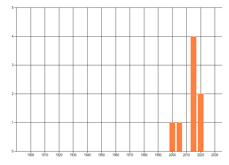 Het aantal atlasblokken (5x5 km) waarin de soort is gemeld binnen een periode van vijf jaar (vanaf 1980) of twintig jaar. Niet gecorrigeerd voor waarnemersinspanning en het aantal doorgegeven waarnemingen kan sterk variëren per periode, dus een trend in verspreiding kan hier niet direct uit worden afgelezen. Het opgegeven jaartal is het eerste jaar van de periode. Bron: gevalideerde waarnemingen uit de NDFF.