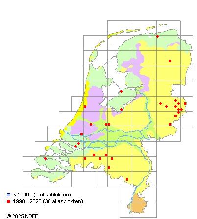 Het aantal atlasblokken (5x5 km) waarin de soort is gemeld binnen een periode van vijf jaar (vanaf 1980) of twintig jaar. Niet gecorrigeerd voor waarnemersinspanning en het aantal doorgegeven waarnemingen kan sterk variëren per periode, dus een trend in verspreiding kan hier niet direct uit worden afgelezen. Het opgegeven jaartal is het eerste jaar van de periode. Bron: gevalideerde waarnemingen uit de NDFF.