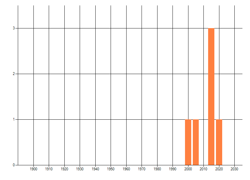 Het aantal atlasblokken (5x5 km) waarin de soort is gemeld binnen een periode van vijf jaar (vanaf 1980) of twintig jaar. Niet gecorrigeerd voor waarnemersinspanning en het aantal doorgegeven waarnemingen kan sterk variëren per periode, dus een trend in verspreiding kan hier niet direct uit worden afgelezen. Het opgegeven jaartal is het eerste jaar van de periode. Bron: gevalideerde waarnemingen uit de NDFF.