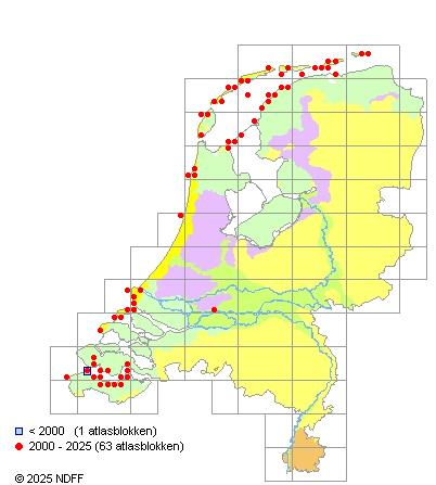 Het aantal atlasblokken (5x5 km) waarin de soort is gemeld binnen een periode van vijf jaar (vanaf 1980) of twintig jaar. Niet gecorrigeerd voor waarnemersinspanning en het aantal doorgegeven waarnemingen kan sterk variëren per periode, dus een trend in verspreiding kan hier niet direct uit worden afgelezen. Het opgegeven jaartal is het eerste jaar van de periode. Bron: gevalideerde waarnemingen uit de NDFF.
