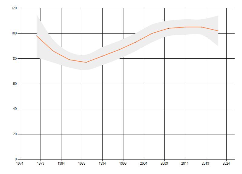 Gemiddelde trend van het aantal kilometerhokken waarin de soort voorkomt, weergegeven als indexcijfer (1975-1978 = 100).